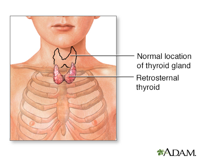 The normal position of the thyroid is at the front of the neck above the sternal notch. In retrosternal thyroid, a portion of the gland extends below the sternal notch.