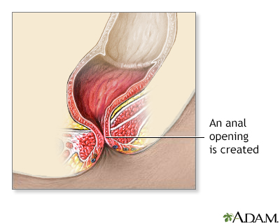 Surgery for a high type imperforate anus defect usually involves creation of a temporary opening of the large intestine (colon) onto the abdomen to allow passage of stool (this is called a colostomy). The baby is allowed to grow for several months before attempting the more complex anal repair.